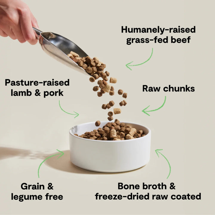 ReWild their diet with this multi-animal protein blend of Ocean Wise recommended wild-caught whitefish, salmon and rockfish, covered in a bone broth and freeze dried raw coating. Bonus freeze dried raw chunks give this grain- and legume-free kibble a protein-packed boost, while superfoods like pumpkin and sweet potato ensure complete and balanced nutrition