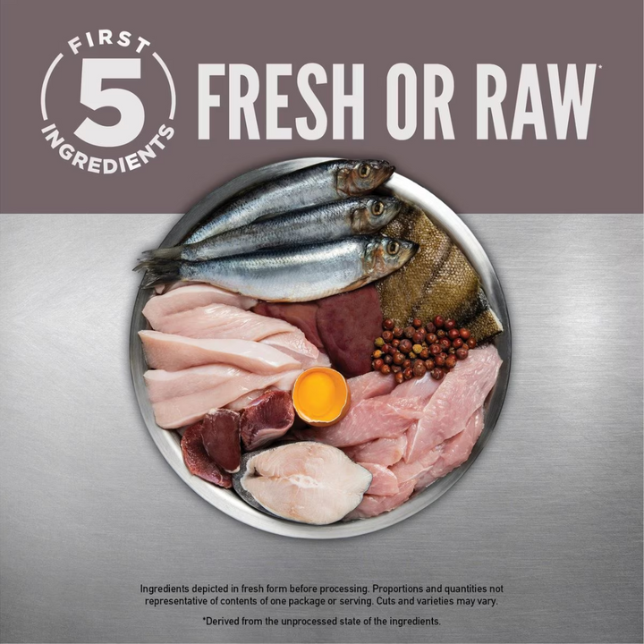 - First 5 ingredients always fresh or raw protein including poultry, fish and organs