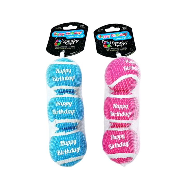 Celebrate your Good Boy or Good Girl with a Happy Birthday Ball 3-Pack! These Grade-A, non-pressurized, non-abrasive tennisballs are perfect for tail-wagging fun without the risk of teeth-troubles. Plus, you get 3 balls in your choice of either 3 pack of Blue or Pink, so your pup can always have one within paw's reach!