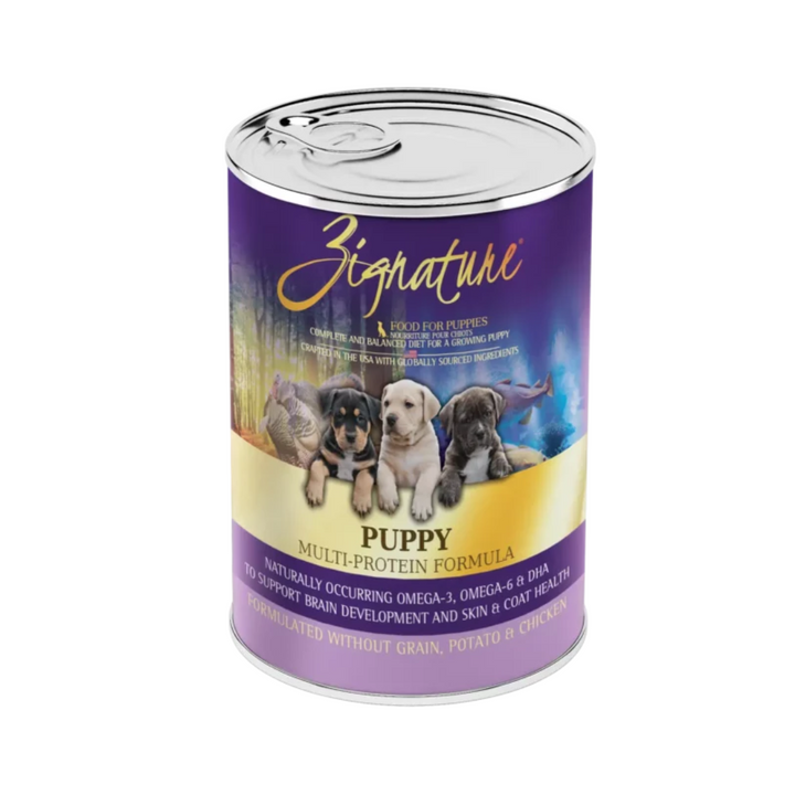 Zignature Canned Puppy Formula is made with the tastiest blend of poultry and fish to give your protein loving pup all the flavors they crave! This formula contains at least 78% moisture, is made with high-quality meats as the first ingredients, and features nutritious ingredients like peas to round out your furry friends well-balance and delicious diet
